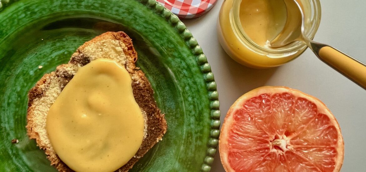 Grapefruit Vanilla Curd; a creamy and tangy curd perfumed with bittersweet grapefruit and smooth vanilla, perfect for dressing up your bakes.